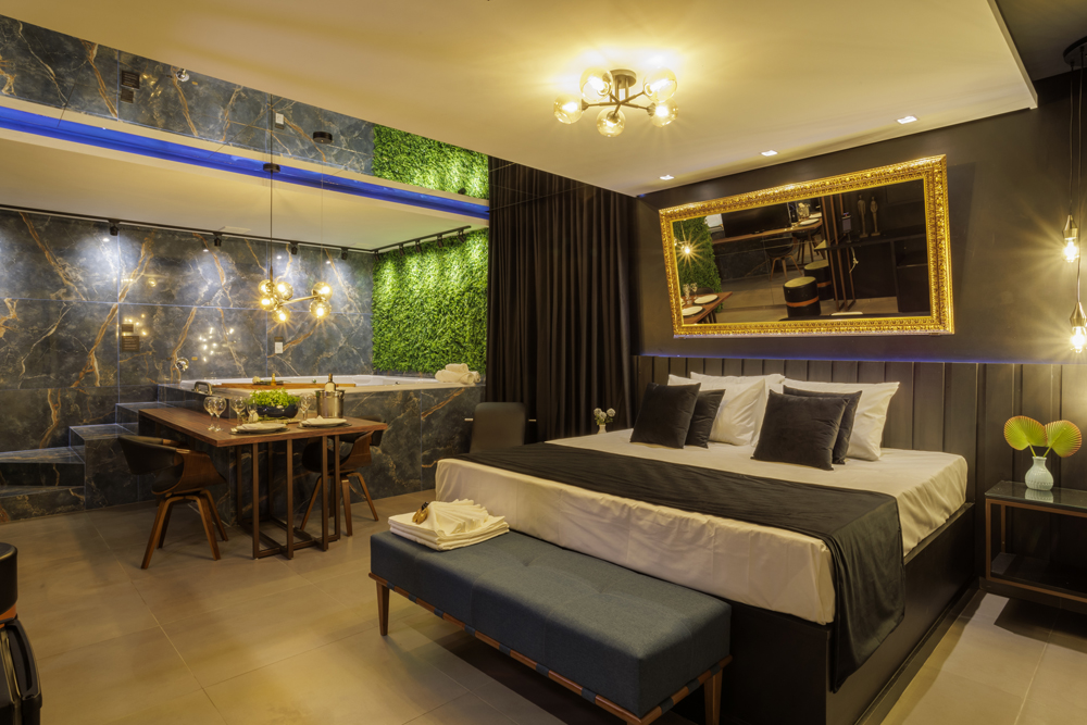 A cama ampla traz conforto e acolhimento, enquanto o divã, posicionado ao lado, abre espaço para o inesperado… para momentos que não precisam de roteiro, apenas de presença.